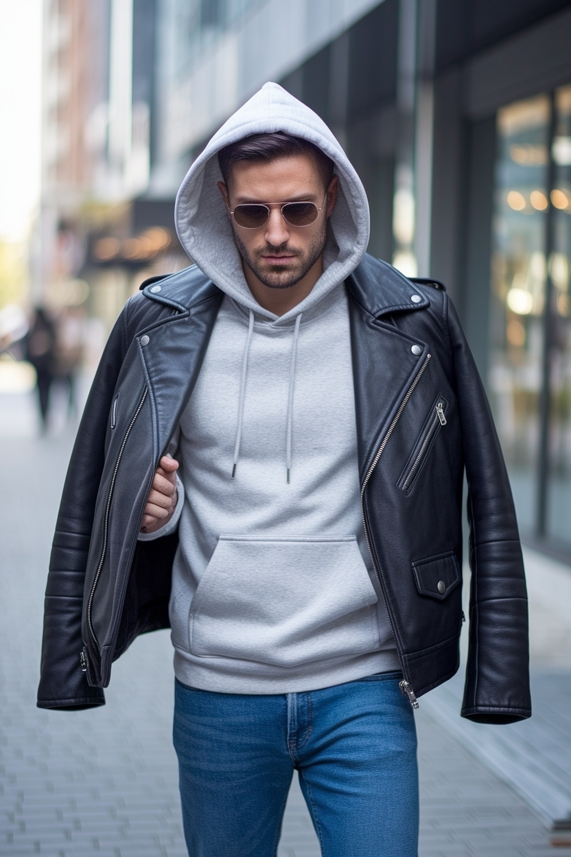 Combining a hoodie with a leather jacket creates a stylish yet edgy look perfect for casual outings or even dinner dates.