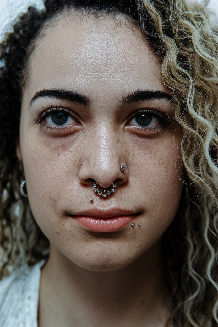 Embrace an edgy aesthetic by pairing your double nose piercing with a septum ring. This look is perfect for festivals, casual outings, or a night out. Here are some styling tips:
