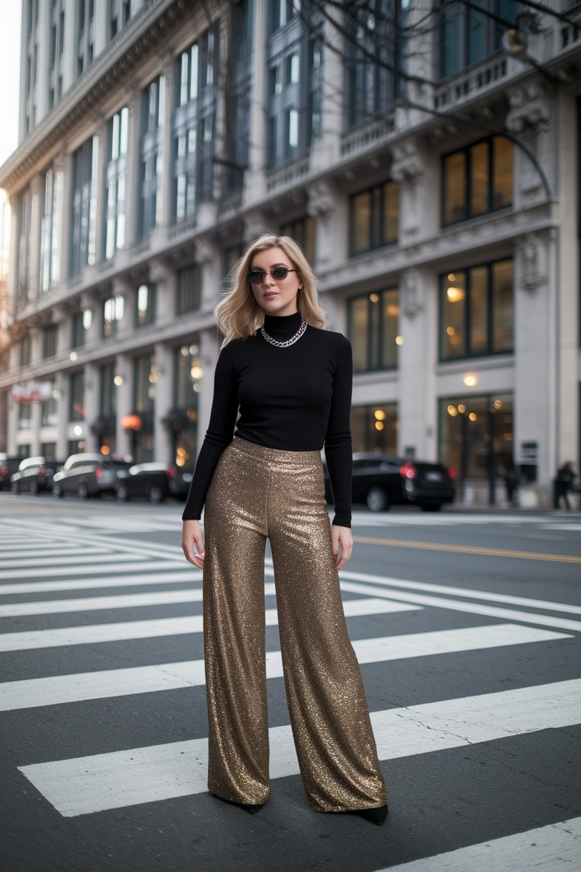 Looking to make a statement this New Year’s Eve? Opt for a pair of high-waisted sequined pants paired with a chic off-the-shoulder top. This ensemble balances elegance and comfort, perfect for welcoming the new year in style.