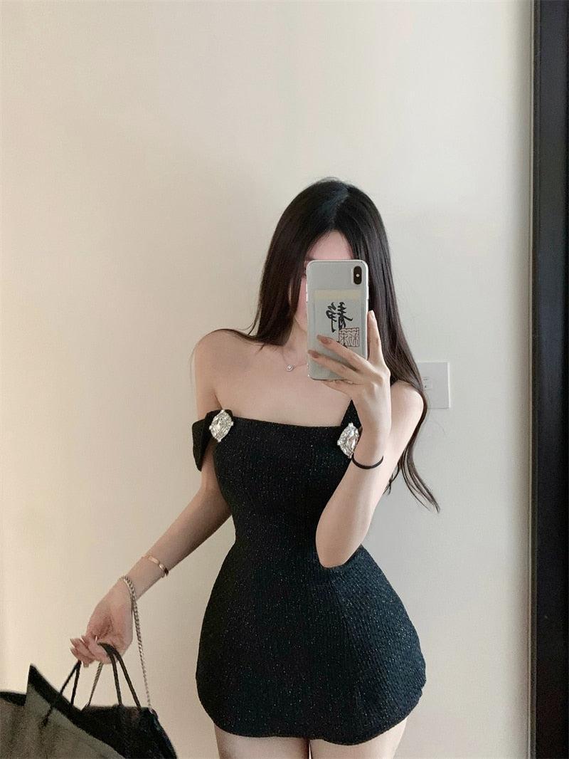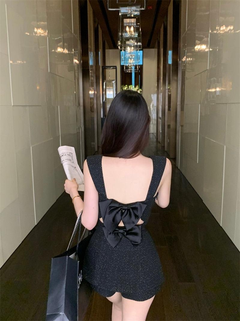 A two-piece set that captures the essence of the Barbiecore aesthetic with a twist. The ensemble includes a striped top adorned with diamond buckles and back ribbons. The top’s movable straps and side zip offer adjustable comfort. Completing the set is a pair of shorts with a discreet back zip. Together, they create a mini dress look that is not only unique but also a stylish nod to the iconic Barbie aesthetic.