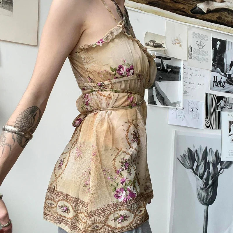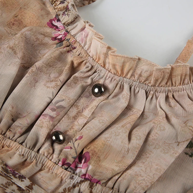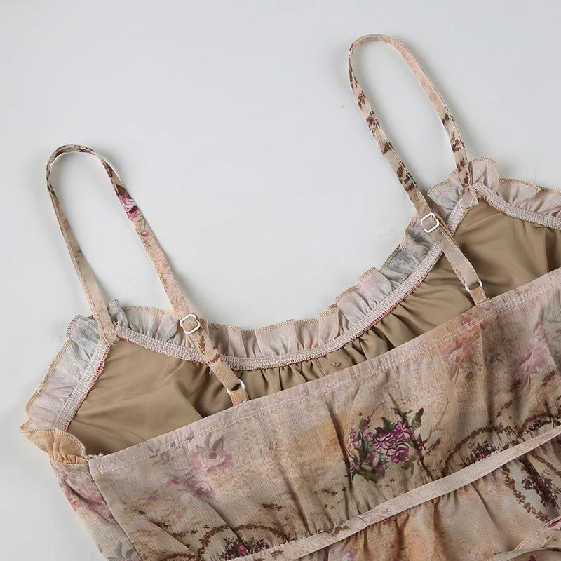 A lightweight top with delicate floral print, ruched bust, and ruffle trims that channel a soft cottagecore vibe. The flowy silhouette with spaghetti straps makes it ideal for pairing with skirts or denim for a romantic yet casual everyday look.