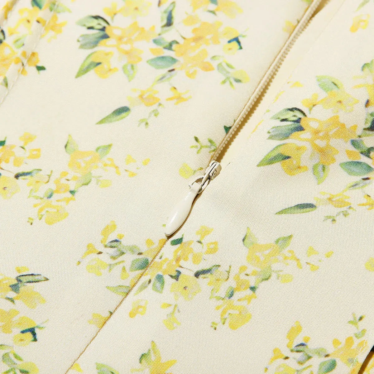 Adorned with a delicate floral pattern, this dress features puff sleeves and a flattering plunge neckline, creating a playful yet refined look. It’s perfect for those sunny days out or a quaint garden party, offering both comfort and style. The soft, pastel palette and fluid silhouette ensure you’ll turn heads with its dreamy, whimsical vibe.
