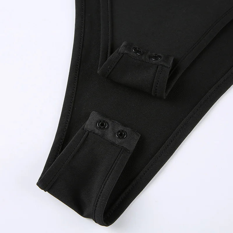 Serve fierce futuristic vibes in this daring black bodysuit. Featuring asymmetric cut-outs, O-ring detailing, and a high-leg silhouette, it’s designed to sculpt your curves and command attention. Whether you wear it solo or layer it under cargos or a sheer skirt, it’s made for main character energy.