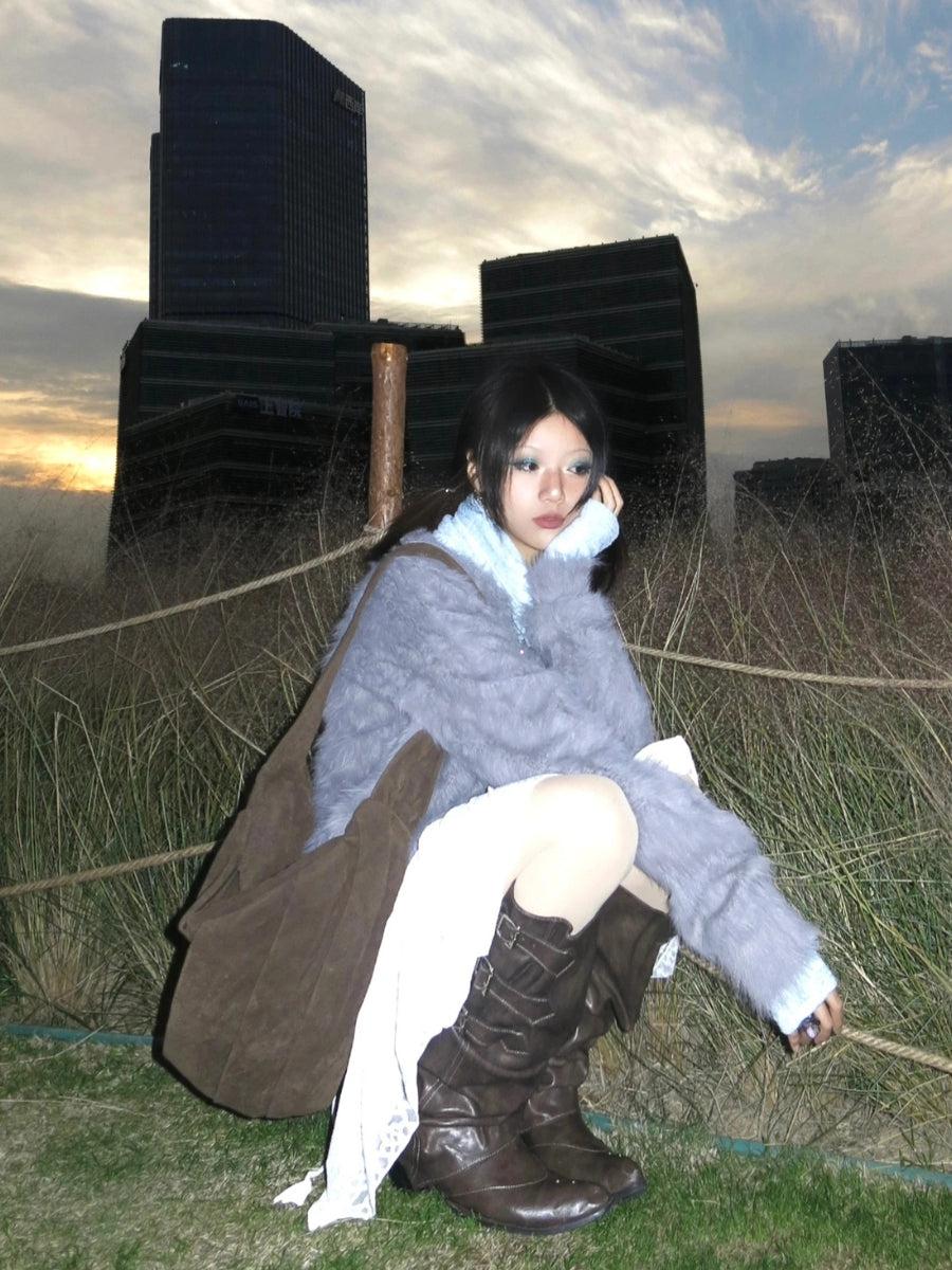 This faux fur cardigan brings cozy luxury with an edgy twist. Designed for warmth and style, the zip-up front and soft shaggy texture make it a must-have for layering. The subtle graphic detail adds a rebellious Y2K-inspired touch.