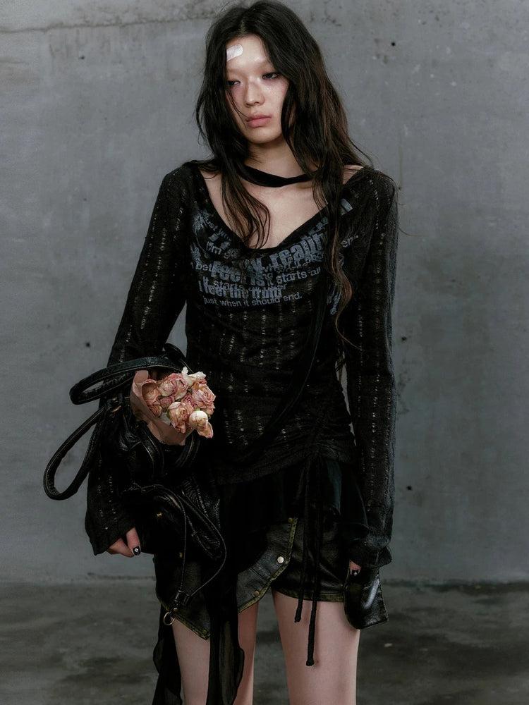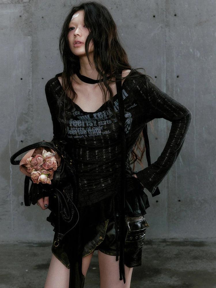 This Grunge Neck Tie Ruffled Top exudes a unique blend of edgy and romantic style. A faded graphic print across the chest enhances the vintage vibe, making this top a standout piece for those who appreciate an alternative aesthetic. Perfect to pair with leather skirts, cargo pants, or layered over fishnet tops for a complete grunge look.