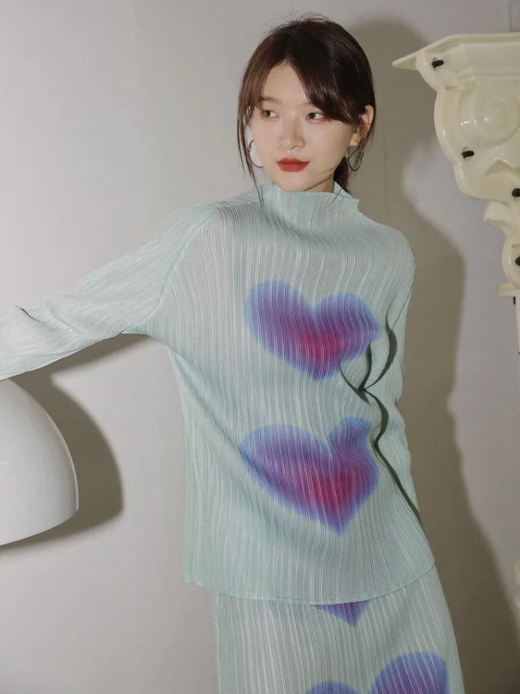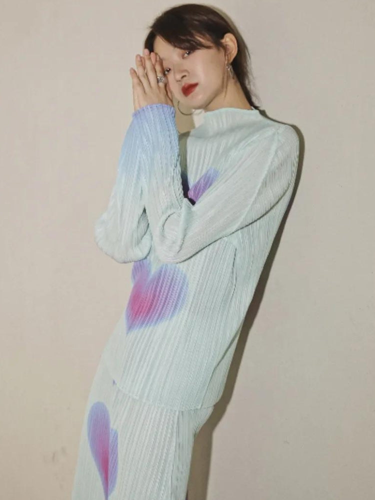 The soft pastel hues and heart motifs blend to create a whimsical and charming outfit that’s perfect for spring days or casual outings. The ribbed texture and fluid pleats provide a tactile delight, ensuring you look as good as you feel. This set is a surefire way to inject some personality into your wardrobe, ideal for those who love to express themselves through stylish clothing.