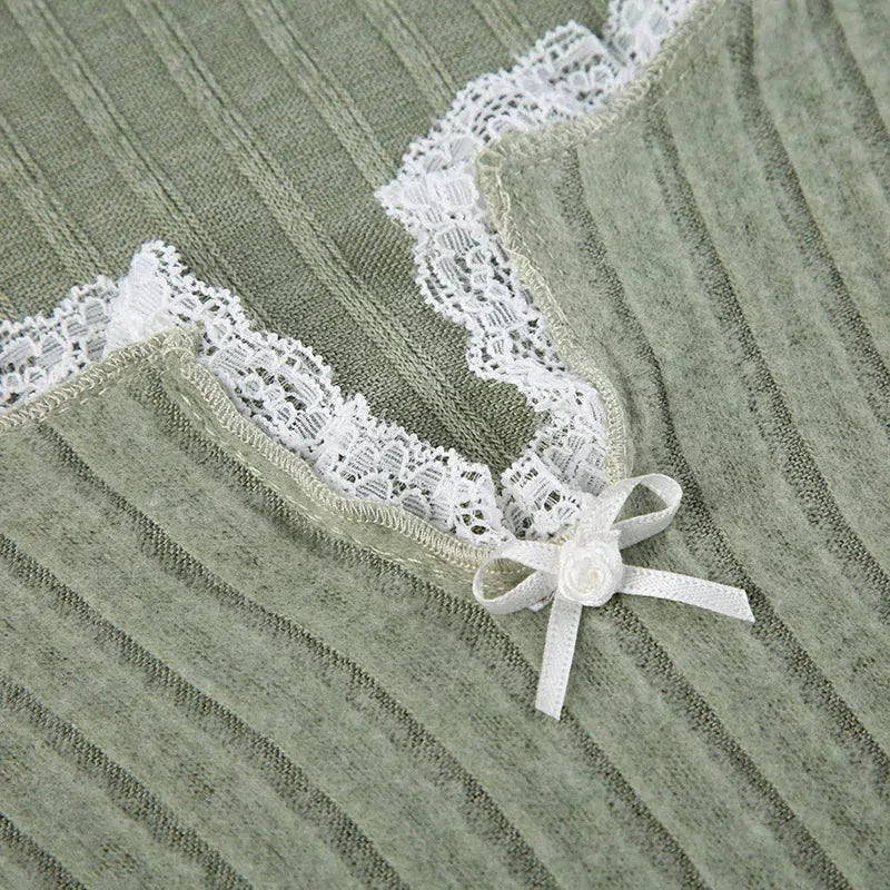 The Lace Trim Ribbed Crop Top adds a cute and feminine touch to any outfit with its delicate lace details and fitted ribbed fabric. Featuring a scoop neckline and subtle bow accent, this top is perfect for casual styling or layering with your favorite jackets.
