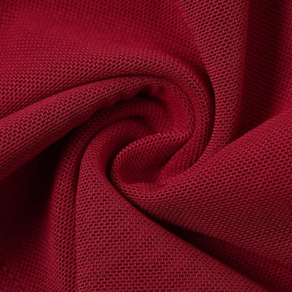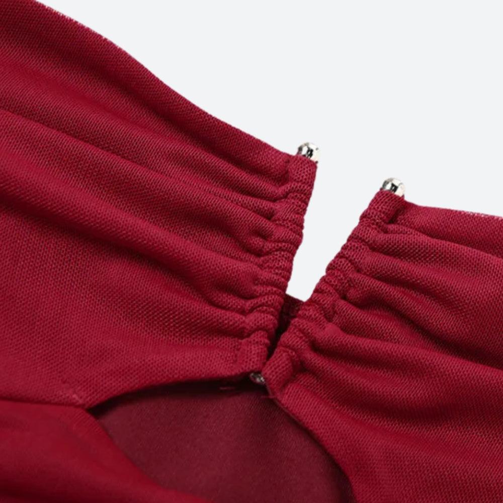 This red mesh halter crop top brings heat with a V-front ruched bust, peekaboo cut-out, and edgy stud accents. The slim fit hugs you just right, making it a standout piece for night outs or streetwear slayage.