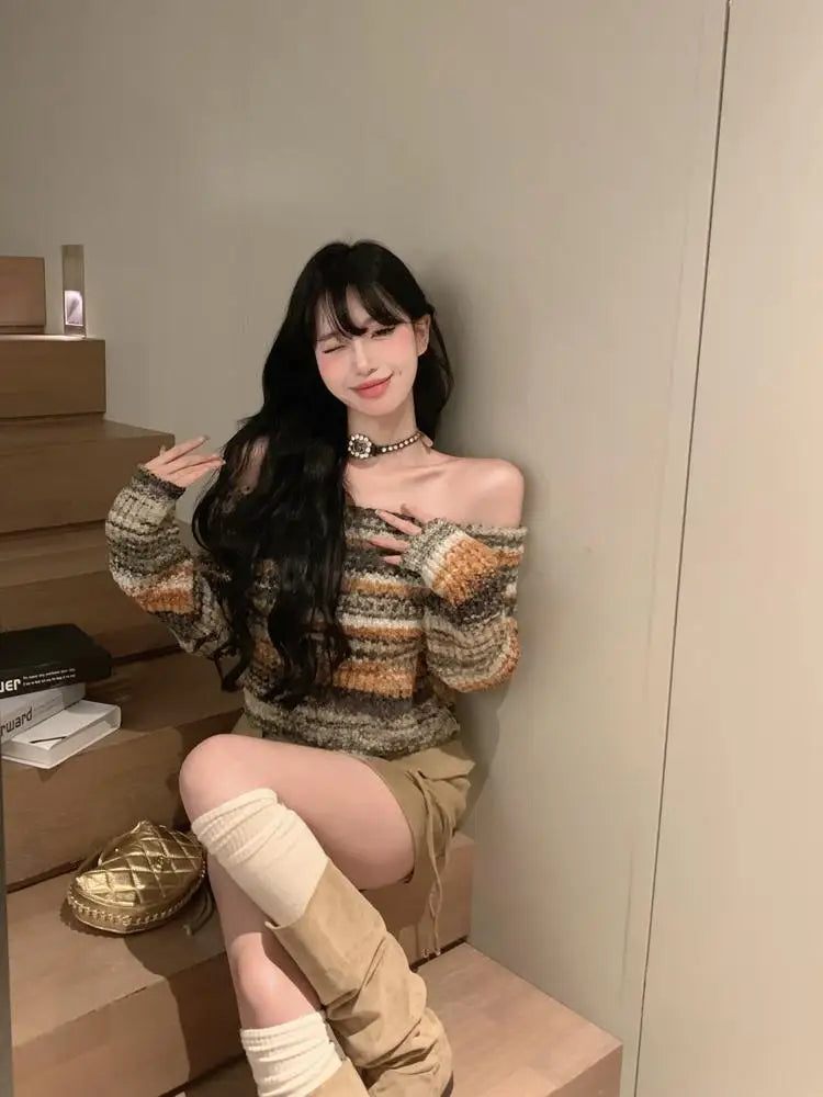This off-shoulder cropped sweater combines effortless charm with a cozy knit design. The striped pattern adds dimension, while the flattering off-shoulder silhouette creates a laid-back yet chic look. Style it with high-waisted skirts or jeans for a versatile outfit.