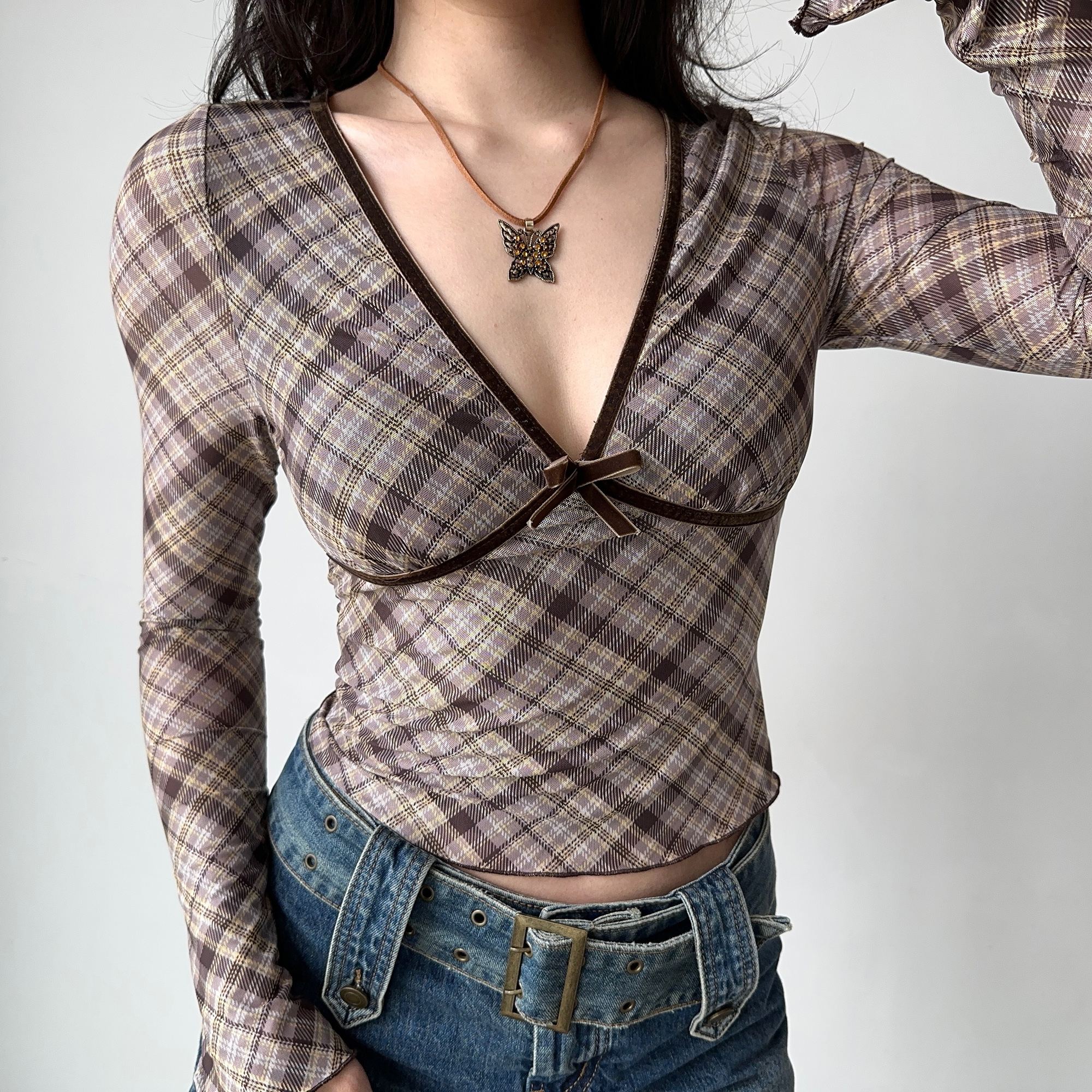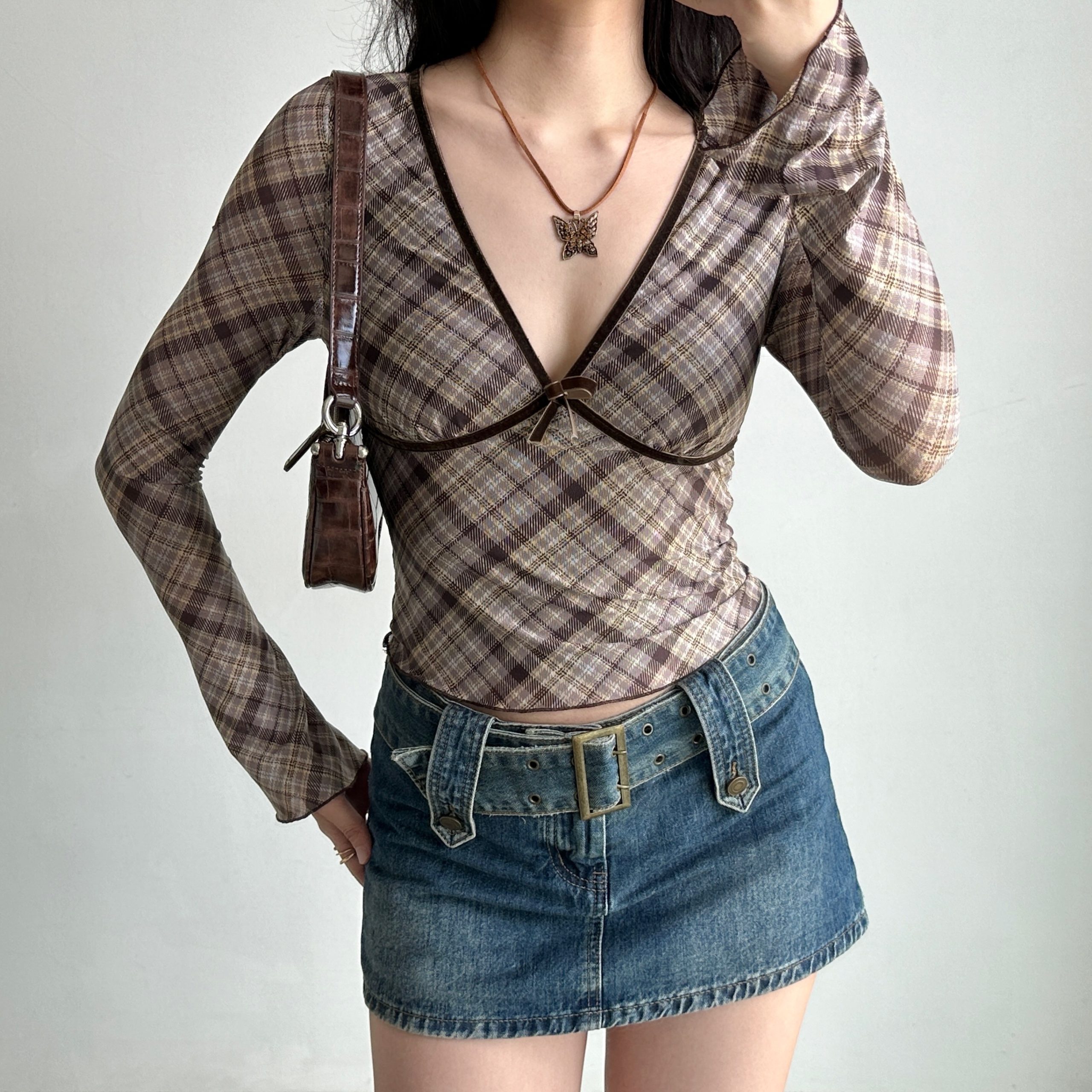 Retro Deep V-Neck Long Sleeve Plaid T-Shirt for Women – Slim Fit Cropped Top, European American Style, 90s Inspired Fashion High-quality product featuring fall clothing trends 2025, fall fashion, outfit inspo and more. Modern design that fits the latest trends. Premium materials ensure durability and comfort. Order now for special offers! Product designed with attention to every detail. Suitable for all occasions and personal styles.