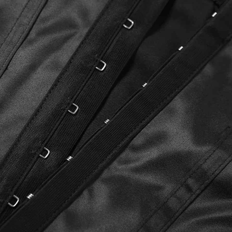 Turn up the flirt factor with this satin corset top. The glossy black finish and front hook detail sculpt your shape, while the white lace trim adds a romantic contrast. Adjustable straps offer a secure fit, making it a dreamy pick for coquette aesthetics, date nights, or layered streetwear looks.
