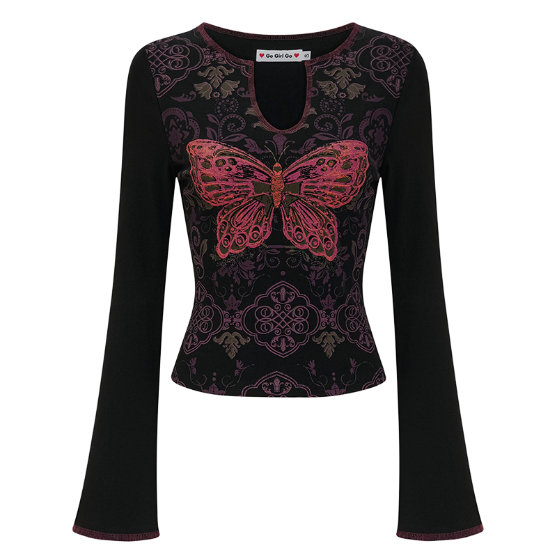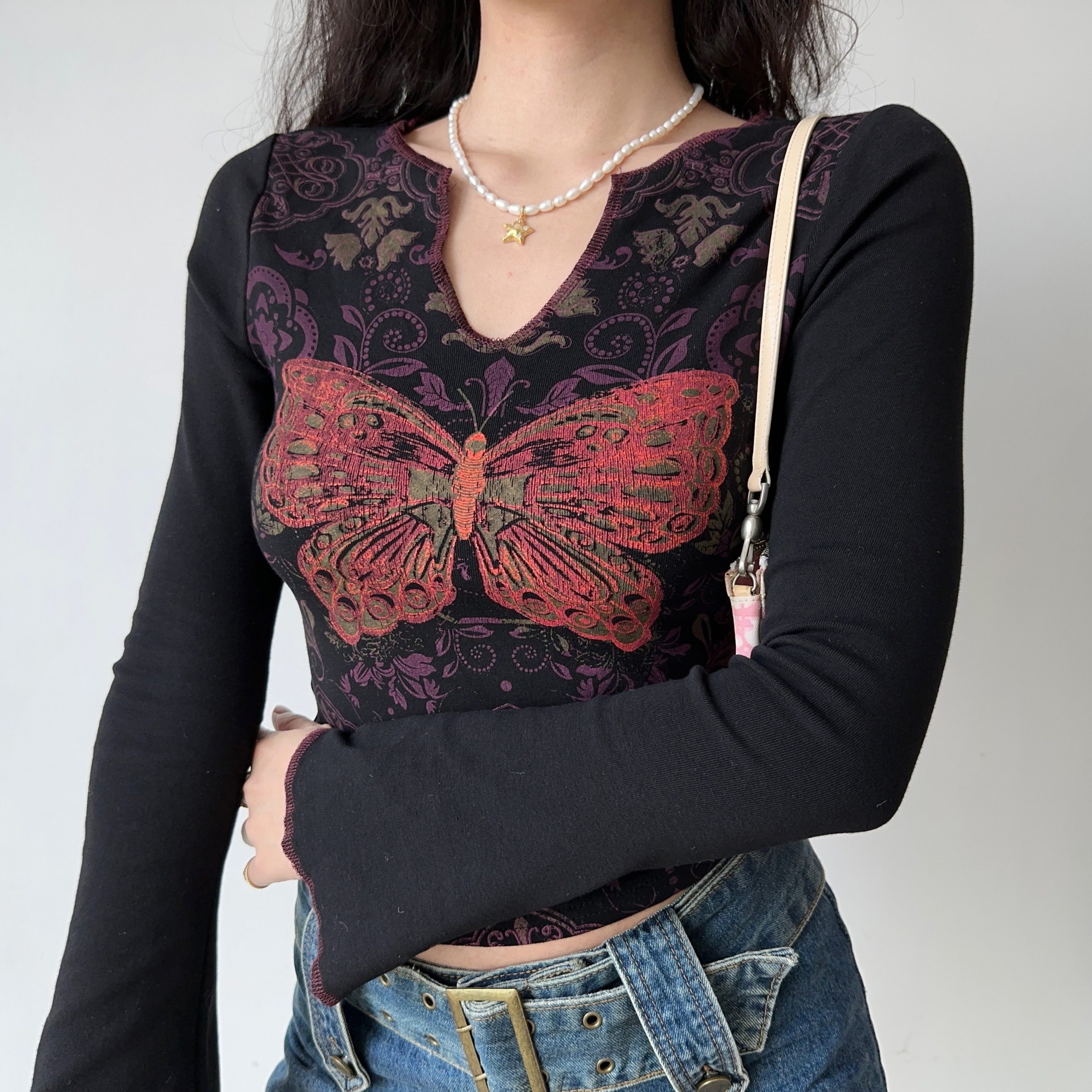 Slim Fit V-neck Long Sleeve T-shirt with Butterfly Print – Re – Summer Fits