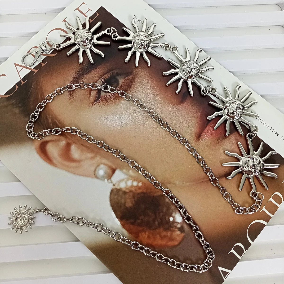 Bold and celestial, this waist chain showcases radiant sun charms linked together with a delicate chain, creating a striking Y2K-inspired statement. Adjustable for the perfect fit, it pairs effortlessly with low-rise jeans, skirts, or layered over dresses for a standout festival or streetwear vibe. A versatile accessory that adds cosmic energy to any outfit.