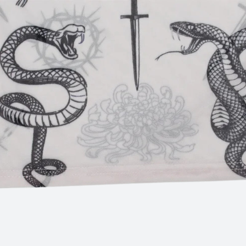 - Print detail: angel, swords, flower, heart, bird, barbed wire, snake, star