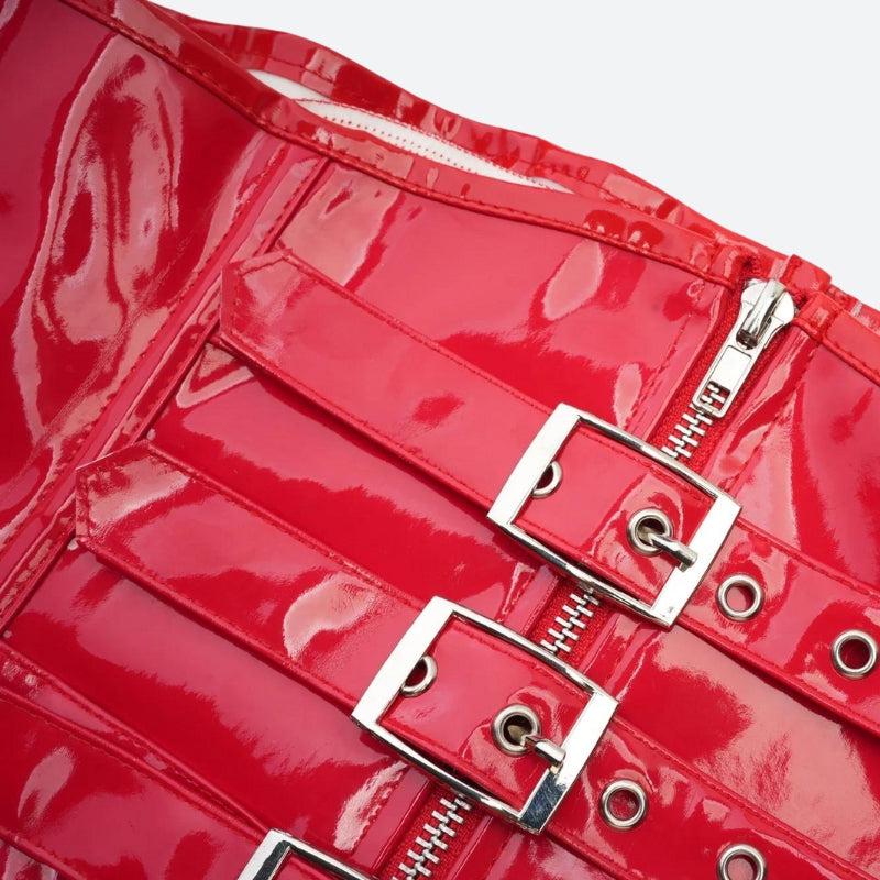 The Underbust Corset Top offers an edgy take on classic corsetry with high-shine faux patent leather. Its waist-cinching design, bold buckled straps, and front zipper add rebellious flair, perfect for layering or wearing solo for a daring style.
