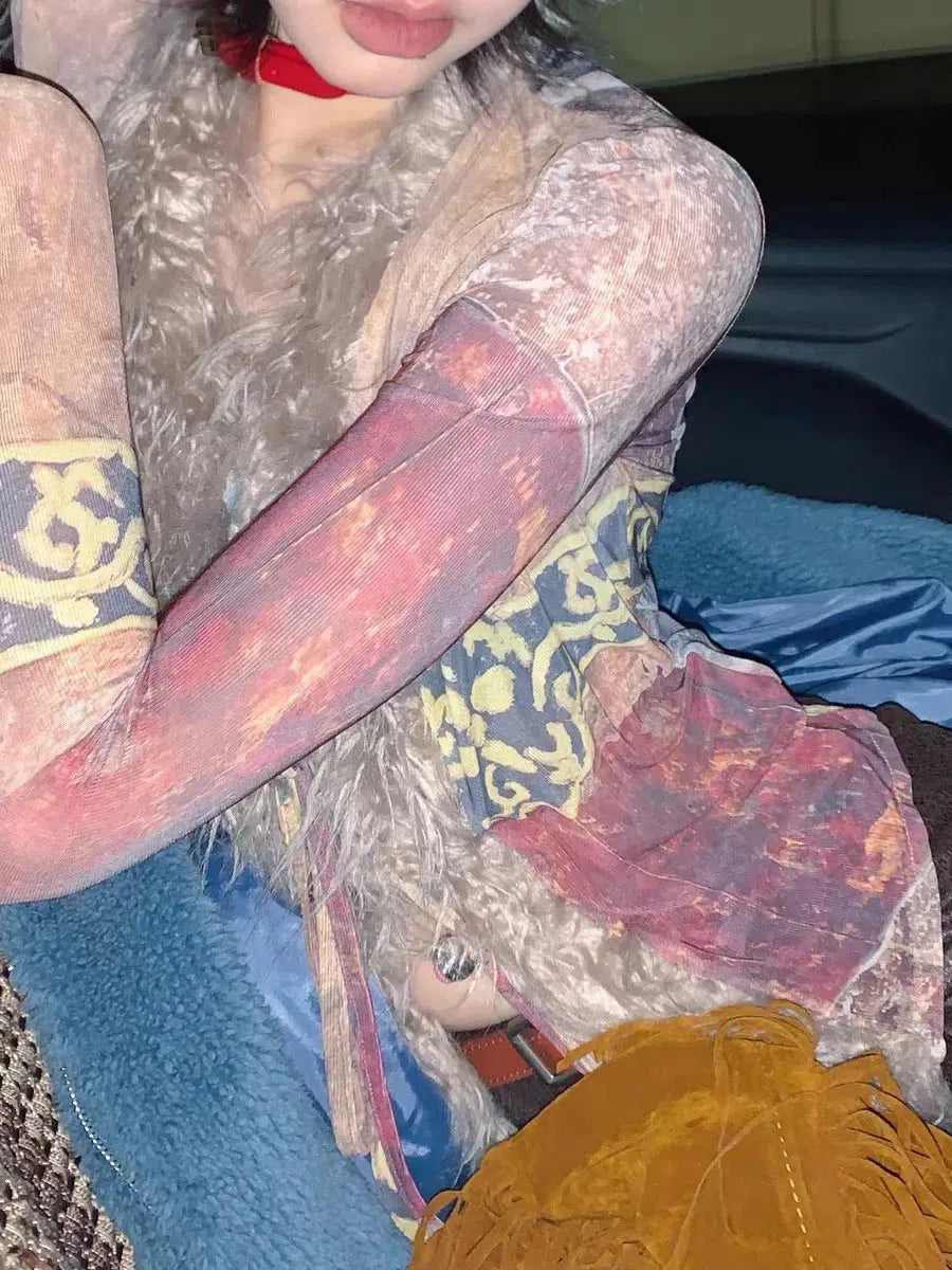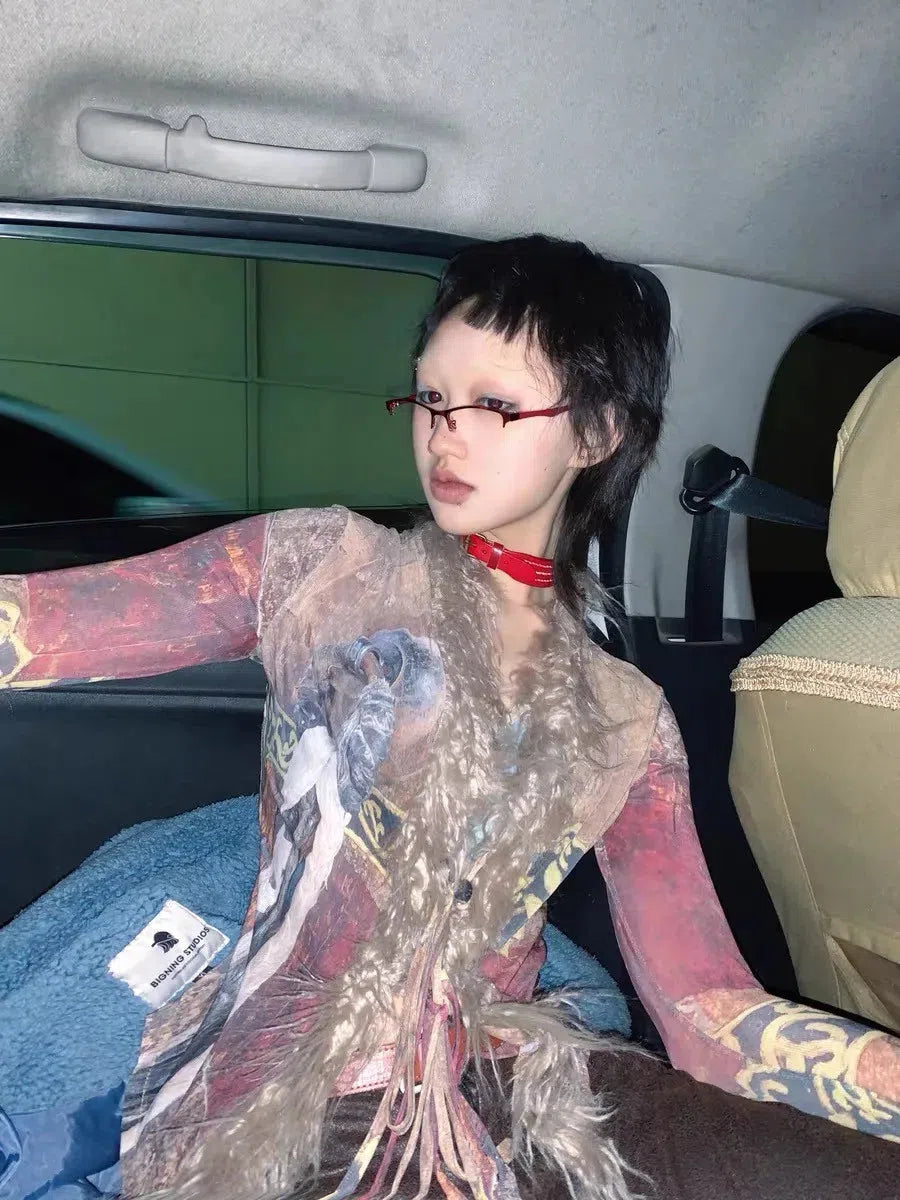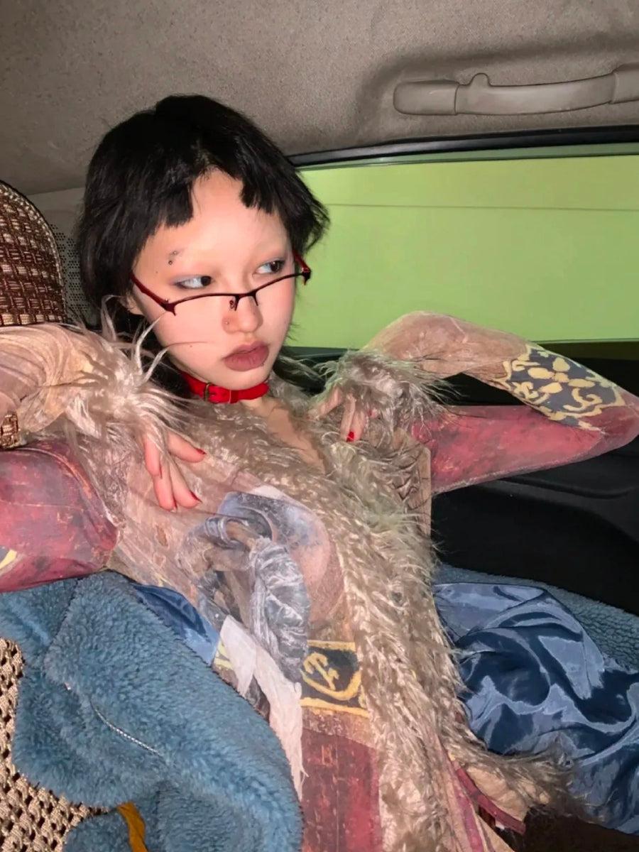 This vintage faux fur tie-front top is the ultimate statement piece for a grunge-inspired look. The distressed patchwork design, shaggy faux fur trim, and lightweight fit make it a must-have for layering. Perfect for adding a bold touch to any Y2K or alternative outfit.