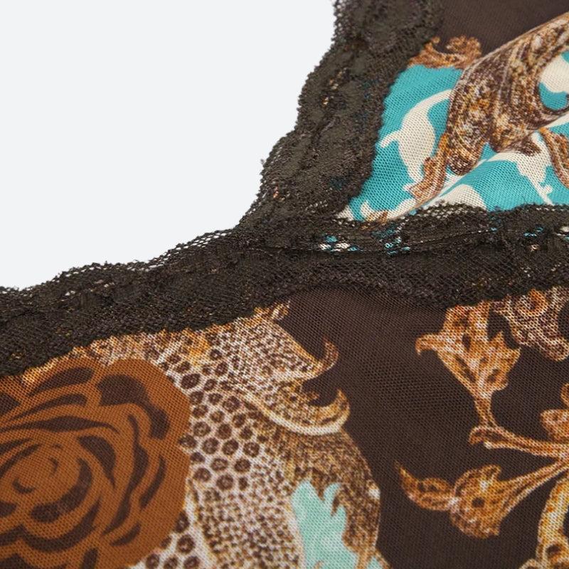 Bring on the sultry nostalgia with this vintage-inspired mesh top. Featuring a baroque floral print in moody tones of chocolate brown, teal, and crimson, it’s trimmed with delicate lace for that Y2K romantic feel. The fitted silhouette and V-neckline add just the right amount of edge—wear it solo or layered for that soft grunge vibe.