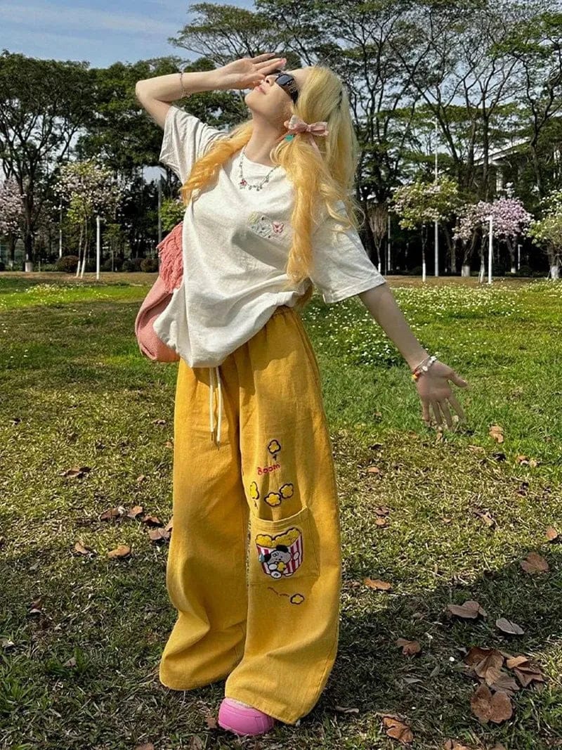 Playful embroidery meets relaxed Y2K energy in these wide-leg pants. Made from breathable fabric with a loose fit and drawstring waist, they’re perfect for casual park days, coffee runs, or styling with oversized tees for a carefree aesthetic.