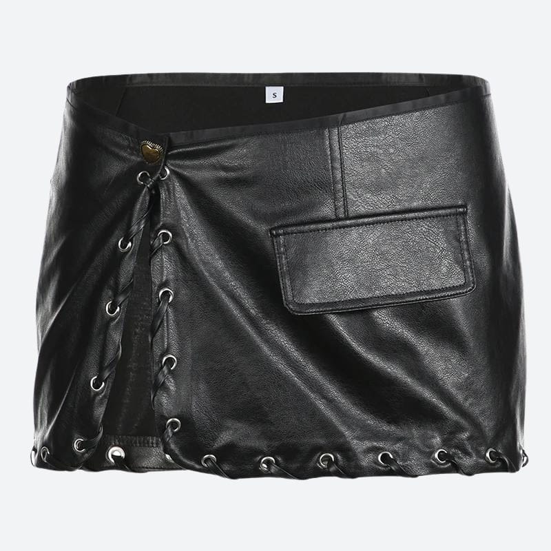 The Y2K Grunge Faux Leather Mini Skirt channels the rebellious spirit of the era with its asymmetric design and low waist. Featuring a heart-shaped button and tie & grommet details, this skirt is the epitome of going-out glam, perfect for parties, festivals, and night outs.