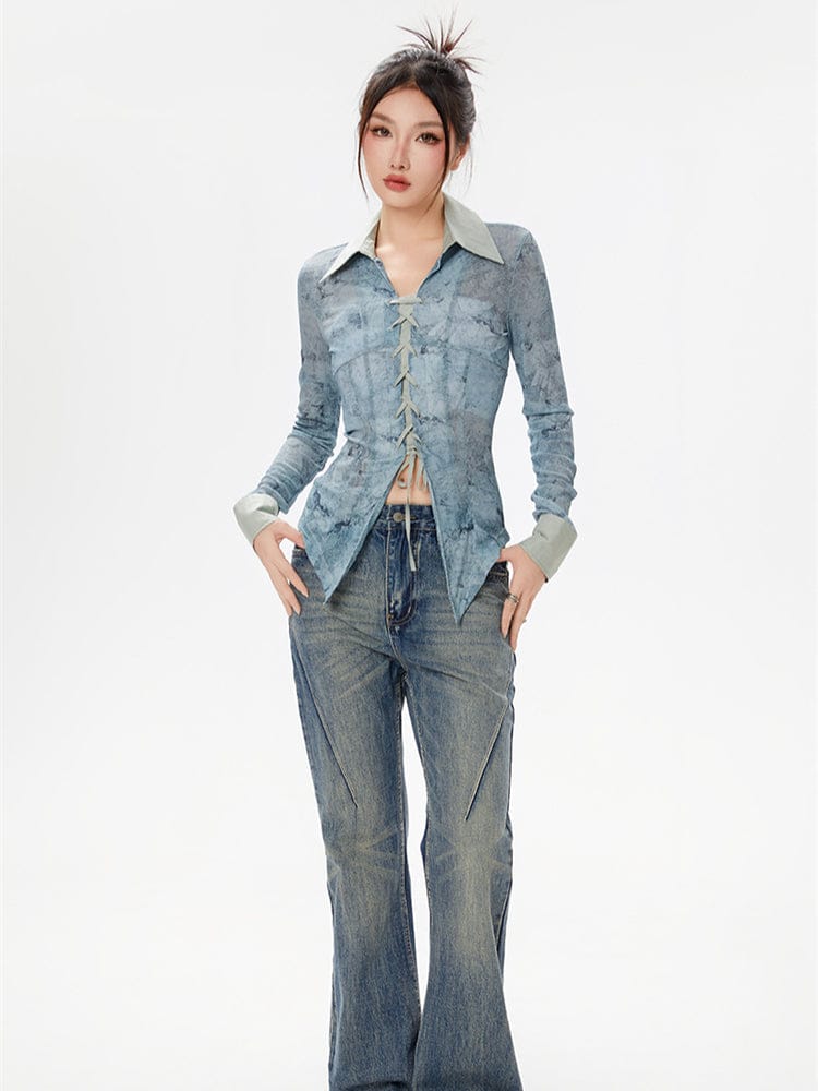 This Y2K-inspired lace-up sheer shirt brings a mix of edgy and chic with its intricate detailing and soft fabric. The light blue tone and lace-up front give a playful yet stylish look for day or night.