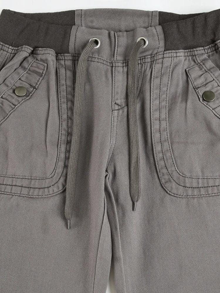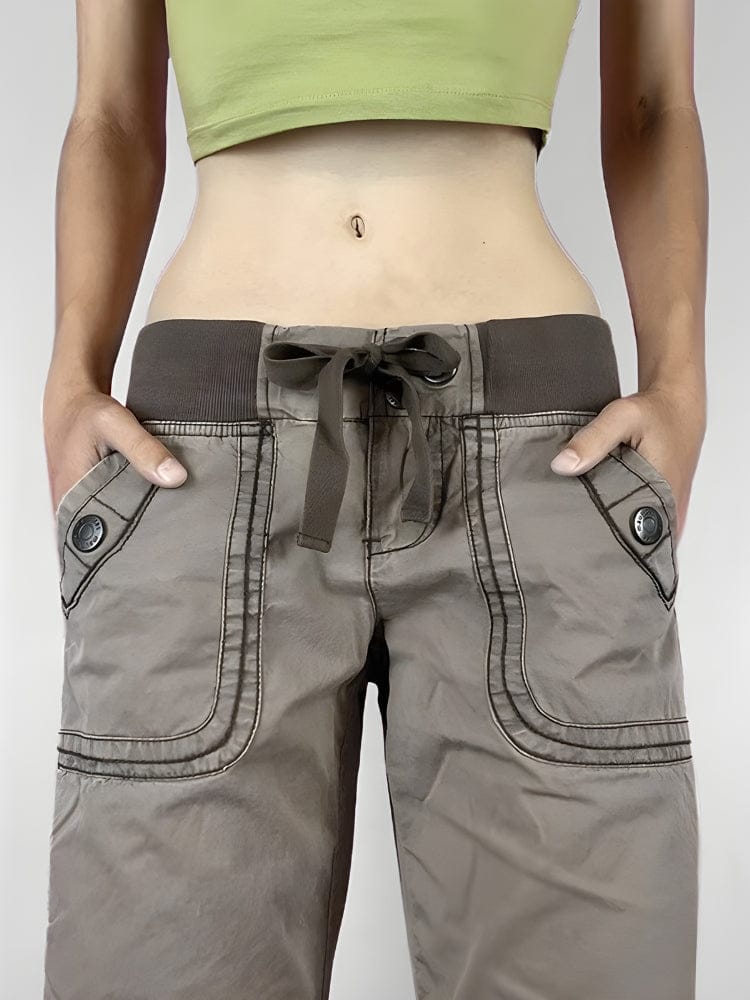 These Y2K-inspired low waist pants blend vintage streetwear vibes with modern comfort. Crafted in a washed taupe tone, they feature a wide-leg silhouette, ribbed elastic waistband, and oversized flap pockets. A go-to for off-duty styling and throwback fits.