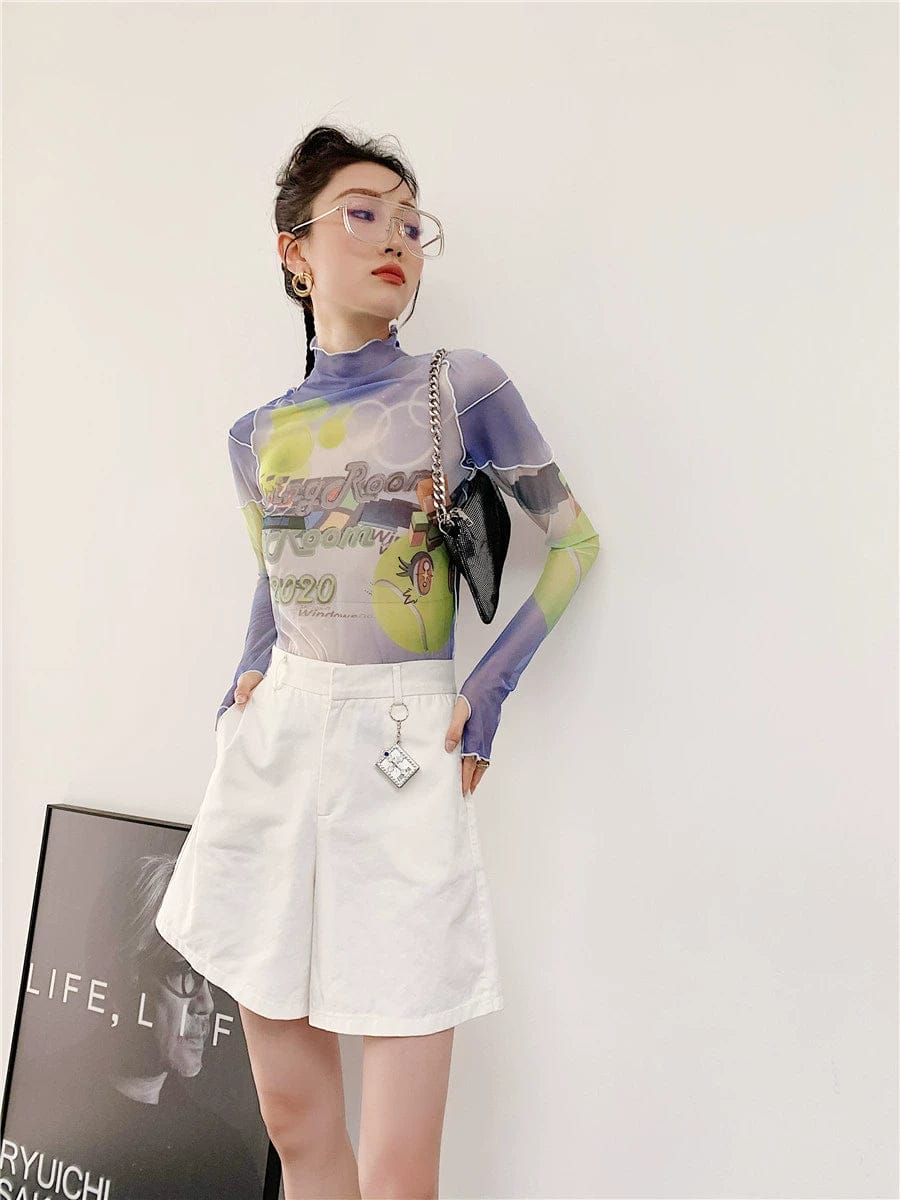 Relive the Y2K era with this fun Minecraft-inspired mesh top. Its transparent design and print detail at the front, along with thumb holes, add a playful yet stylish touch. Great for casual wear or as a quirky addition to your streetwear collection.