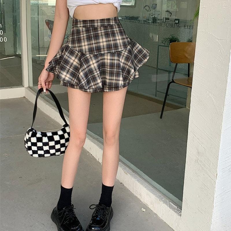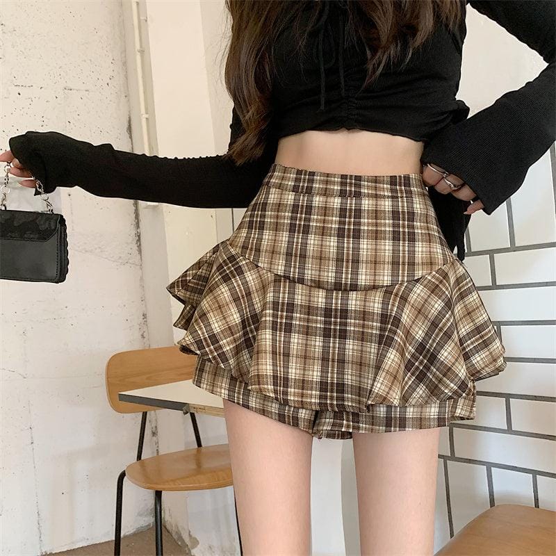 Classic plaid gets a playful twist with this ruffle-layered skort. The mini length and built-in shorts make it cute yet functional, perfect for pairing with crop tops or oversized knits. A must-have for Y2K, preppy, and coquette-inspired fits.