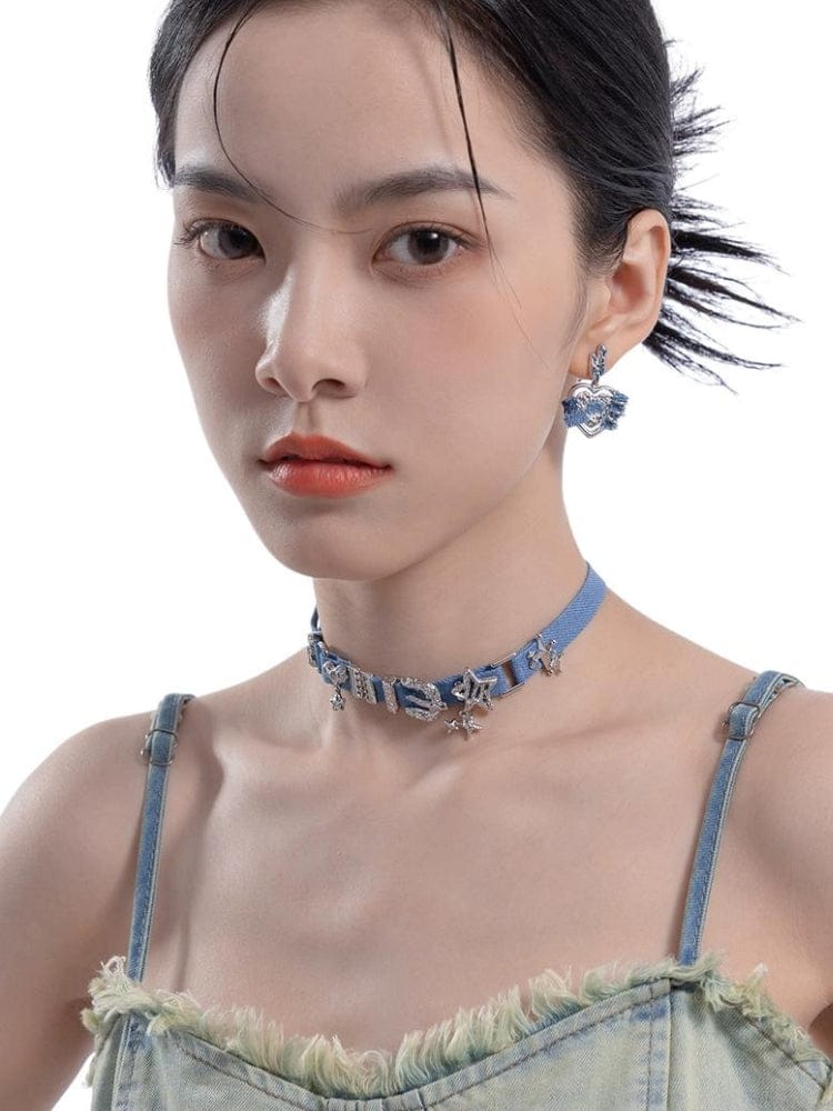 Add a touch of Y2K flair to your outfit with this sparkle denim choker necklace. Featuring playful charms and a heart buckle, this choker offers a trendy and nostalgic vibe. Perfect for elevating your casual looks, it combines edgy style with a touch of sparkle.